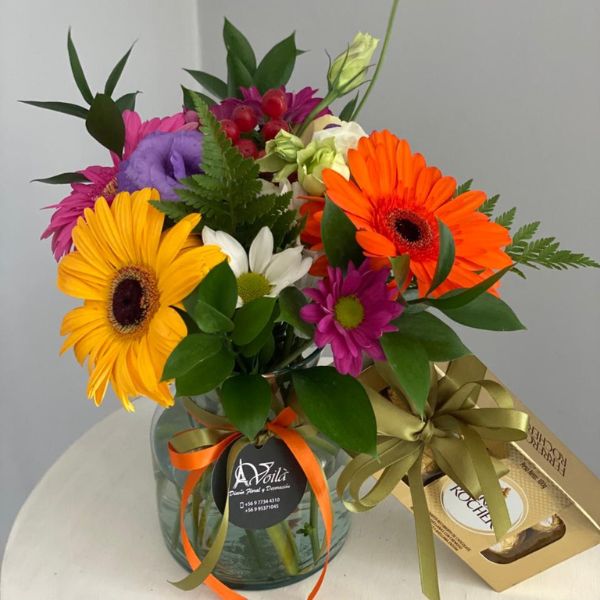 Selección floral de la temporada en una composición alegre y colorida acompañada de chocolates Ferrero Rocher, combinación perfecta de color y dulzura inolvidable.