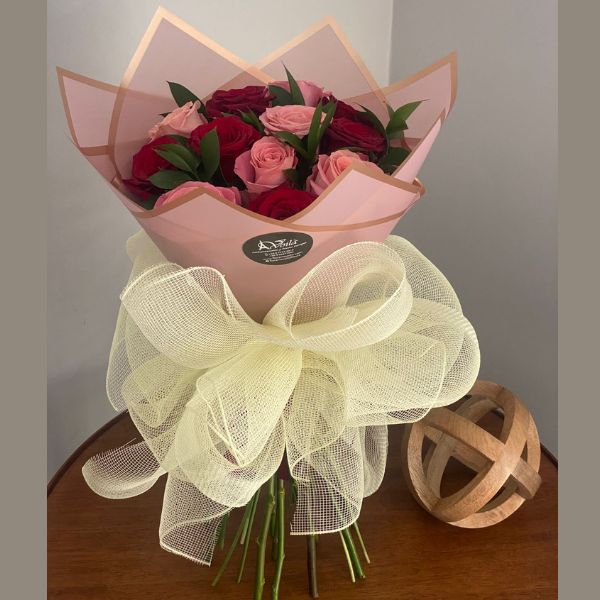 Armonía de rosas rojas y rosadas, envueltas en un delicado packaging de lujo, para expresar amor, ternura y conexión verdadera.