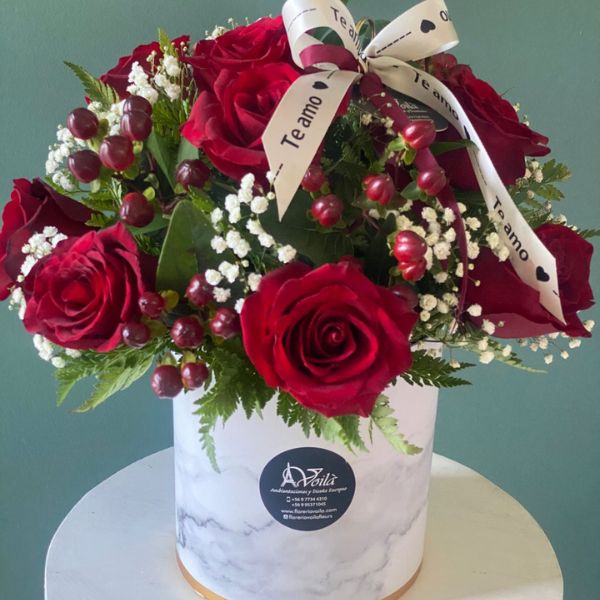 Elegante arreglo de rosas rojas seleccionadas, acompañadas de Fillers y follajes presentadas en caja de diseño. Un detalle perfecto para decir “Te amo” con belleza, emoción y elegancia.